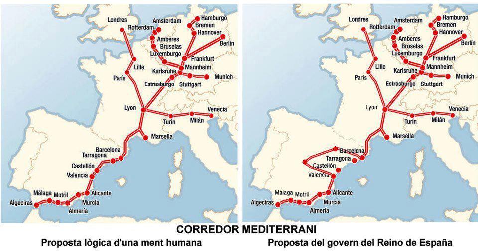 Today twitter is full of odd maps (like the one on the right, below) and many Catalans feel that the "Mediteranean" corridor Minister Pastor speaks of will in fact go through Madrid! A public clarification is in order!